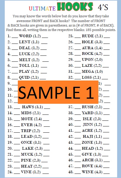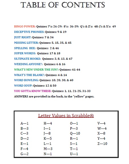 Fun #1 allows puzzlers to solidify their short word (2-4 letters) knowledge and hone their "bingo" (7-8 letter word) knowledge. Its 50 puzzles (13 different types) focus on different elements important to learning words, particularly ones useful for the games of Scrabble®, Boggle®, & Bananagrams®.