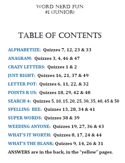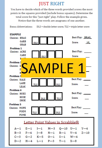 Fun #1 (Junior) sets out to give youth (primarily aged 12 and below) the opportunity to learn about how letters interact to make words and how words are relatable to one another. Its 50 puzzles (12 different types) introduce puzzlers to many skills important to being successful in word games (incorporating blanks, anagrams, spelling, etc.). Several puzzles also challenge students to associate numeric values to letters and, ultimately, to words (as done in the game of Scrabble®).